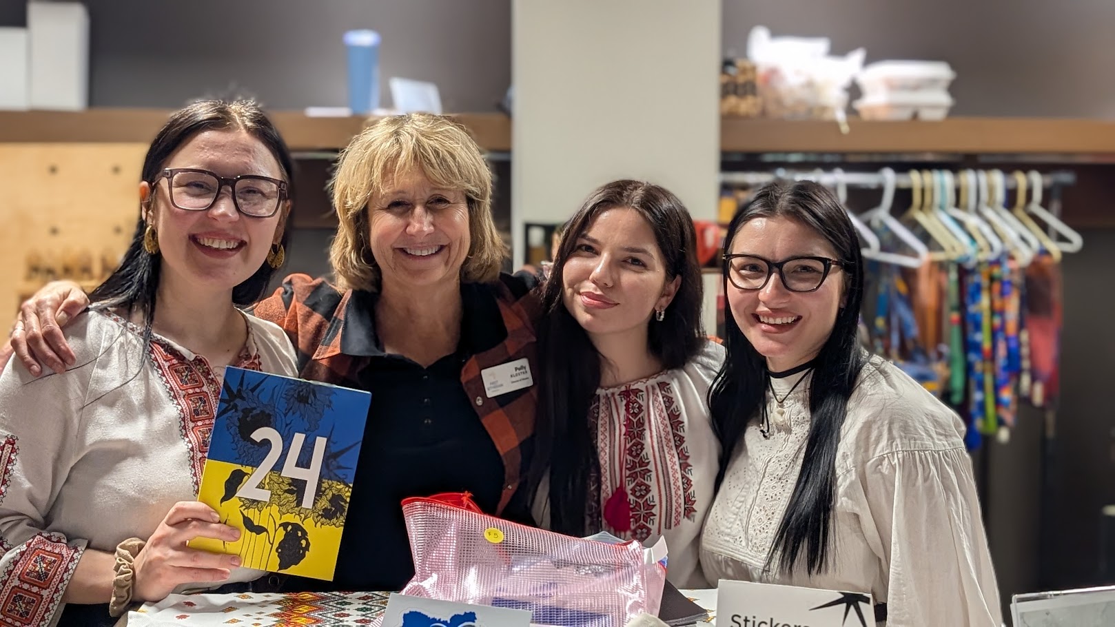 Three Ukrainian refugees, brought to the community through our ministry, proudly stand alongside Patti at an event showcasing Mariia's incredible book. Mariia, a recent graduate from Central Lakes College, wrote and illustrated this beautiful work, highlighting her journey and talent.